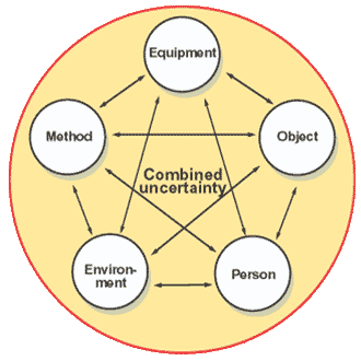 Diese Abbildung zeigt, dass es viele verschiedene Komponenten gibt, die bei der Berechnung eines einzigen kombinierten Messunsicherheitswertes Einfluss haben. Um Ihre Kalibrierunsicherheiten zu minimieren, müssen Sie jede Komponente in diesem Kreis bewerten und optimieren.